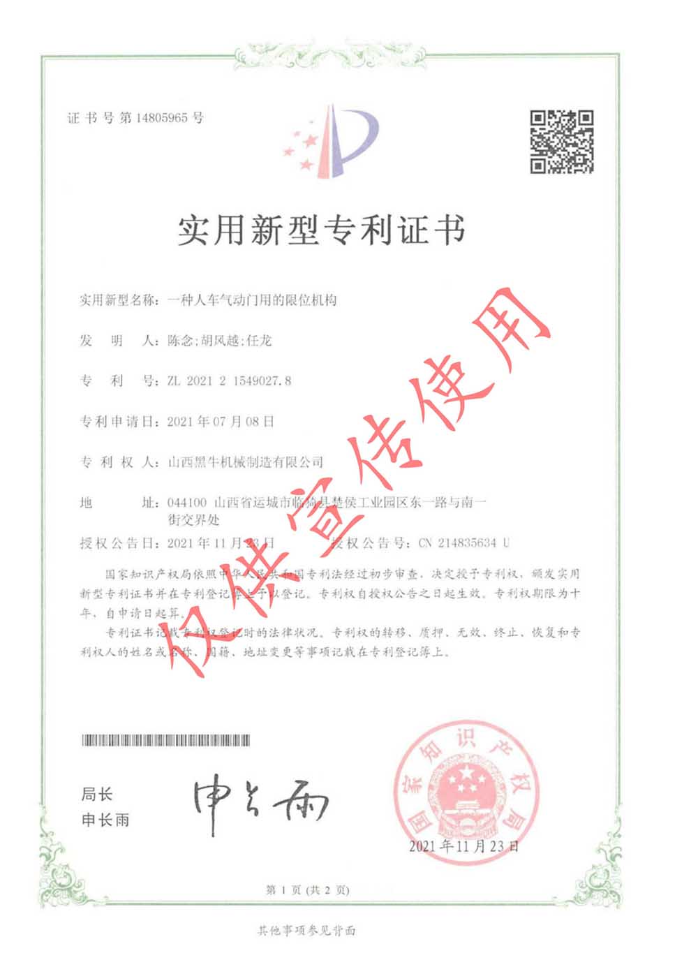 實用型專利證書
