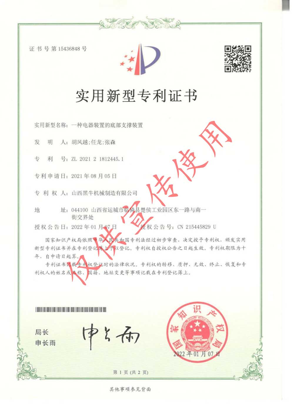 實(shí)用型專利證書