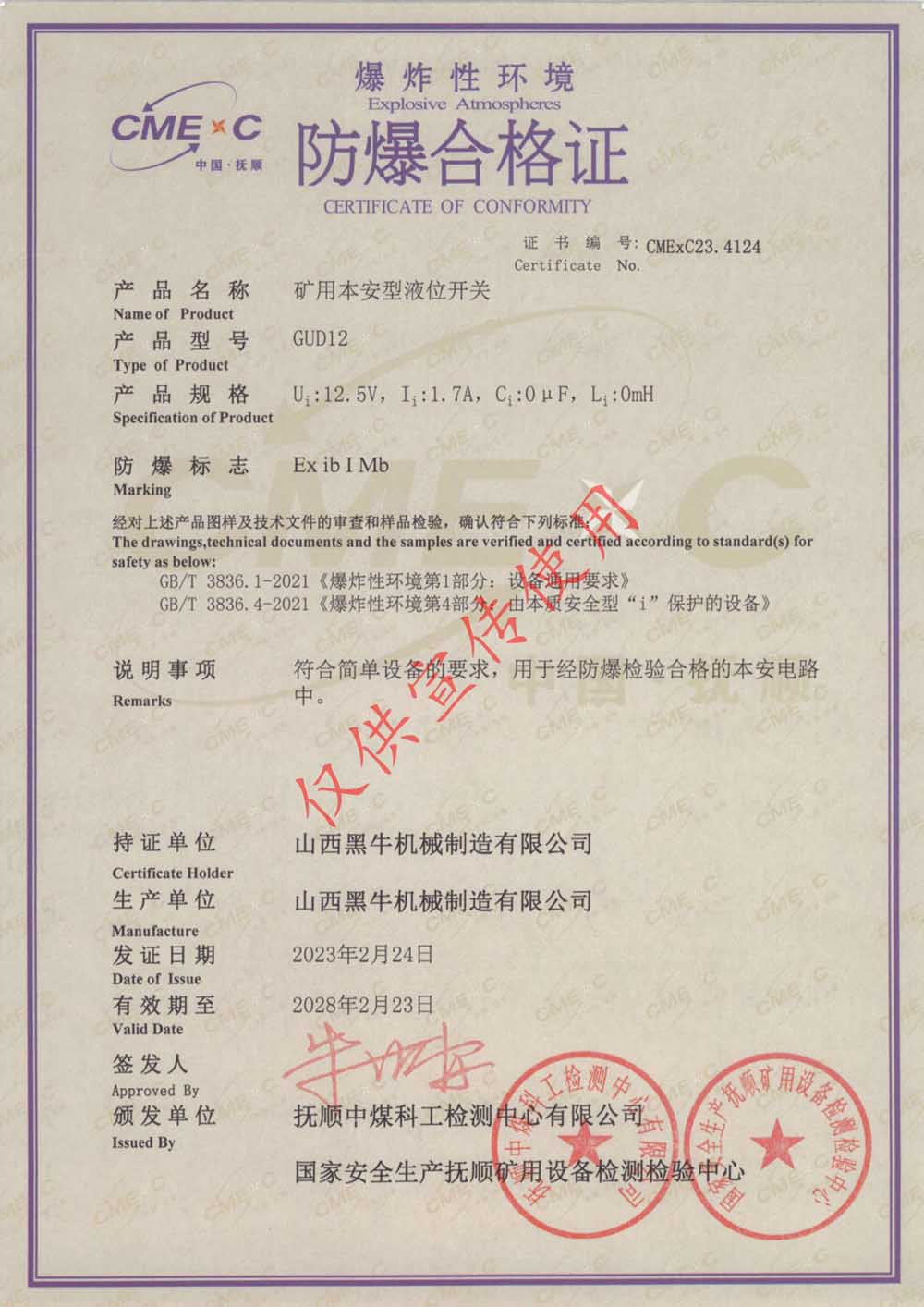 礦用本安型液位開關合格證